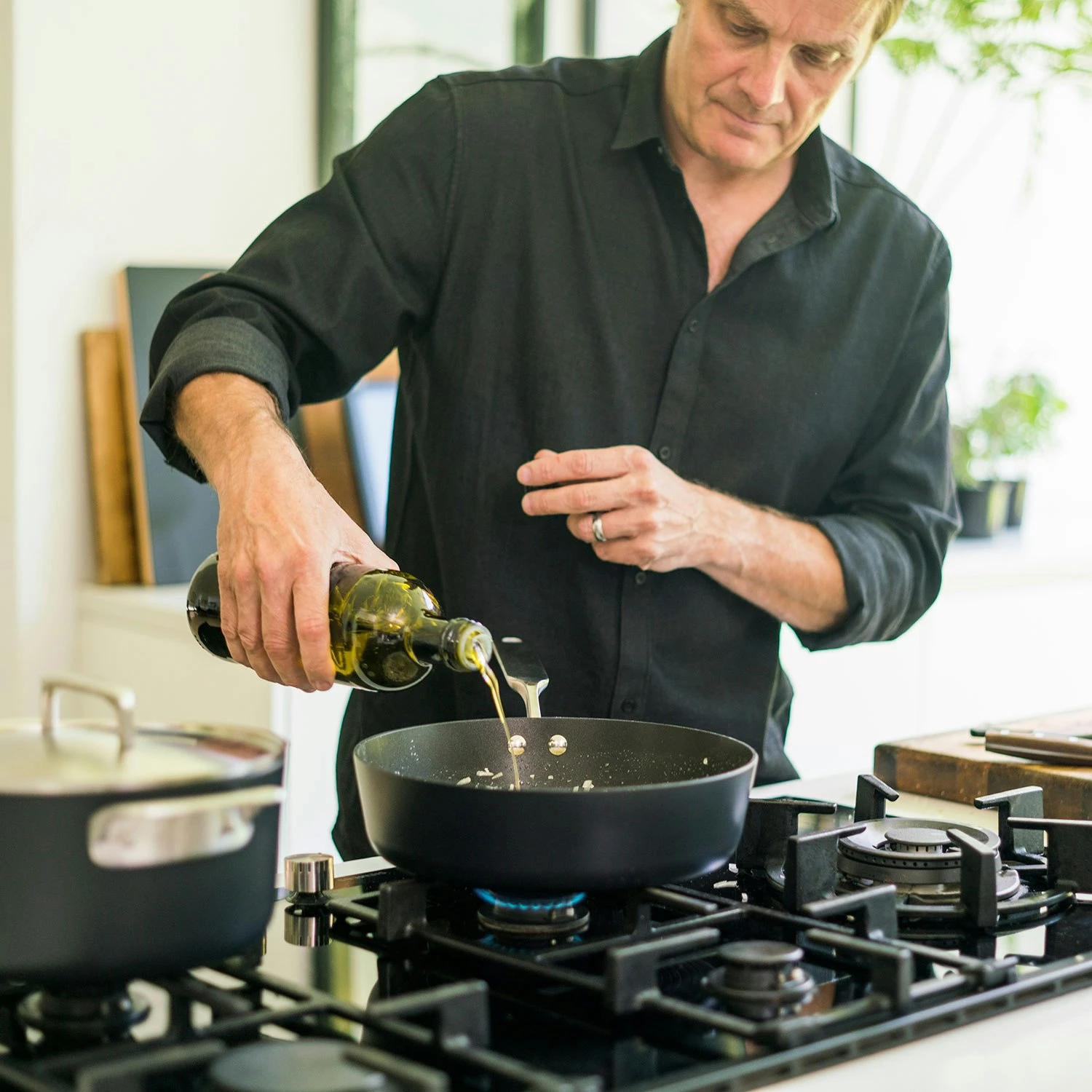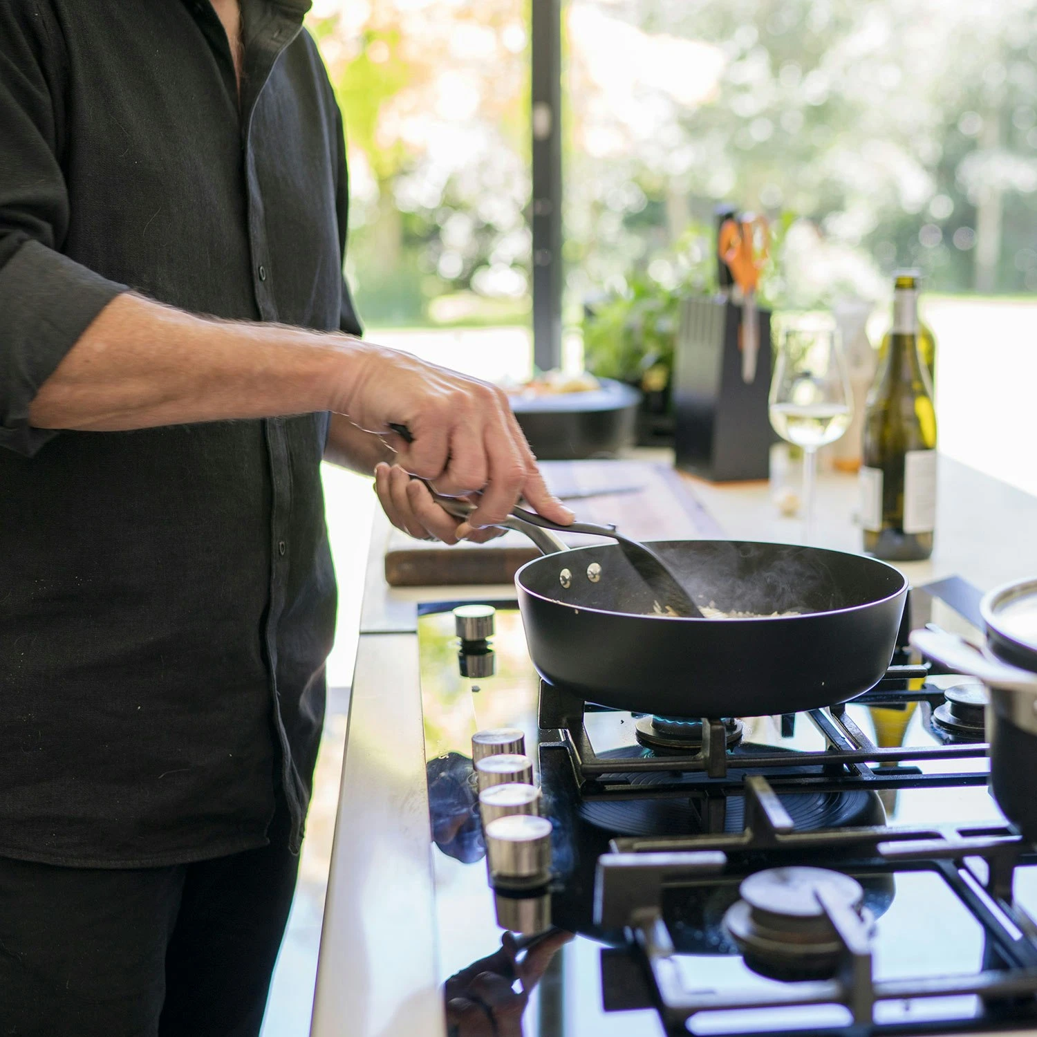 Rotisser sauté pan by Pentagon Design. The Rotisser sauté pan is for the sophisticated chef that values the highest quality and lasting design. The sauté pan is made in thin aluminium with a non-stick Hardtec Superior coating that makes sure nothing sticks and the heat distribution is fast and evenly conducted. The sauté pan has the new technology called OptiHeat which prevents the sauté pan from overheating on inductionhobs. Fits all heat sources including induction and is oven safe up to 240C degrees. Safe handle in stainless steel that stays cool. Dishwasher safe. Safe for kitchen utensils in metal.