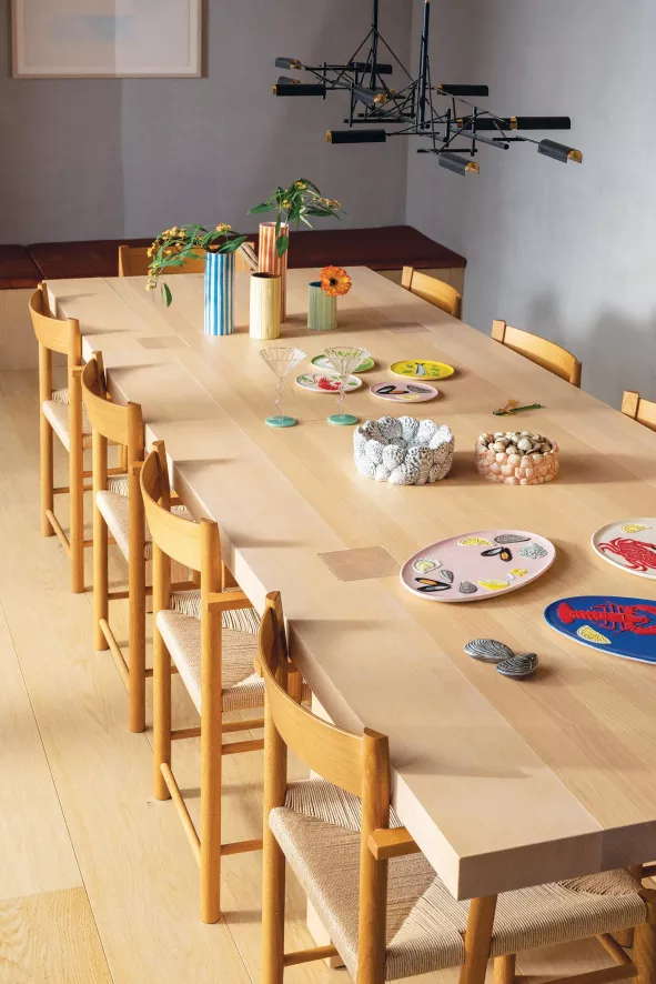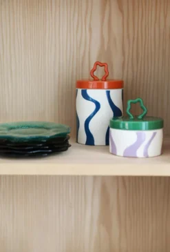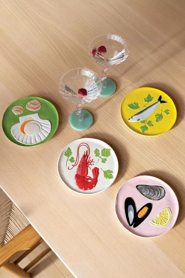 De la mer gebaksbordje Ø16 set van 4 van &Klevering bestaat uit vier verschillende gebaksbordjes met elk een diameter van 16 centimeter en een hoogte van 1 centimeter. De bordjes zijn gemaakt van dolomiet en hebben elk een andere kleur en print. De kleurrijke borden zijn vaatwasser bestendig.